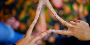 Frau hält bunte Steine in den Händen. Rohtext